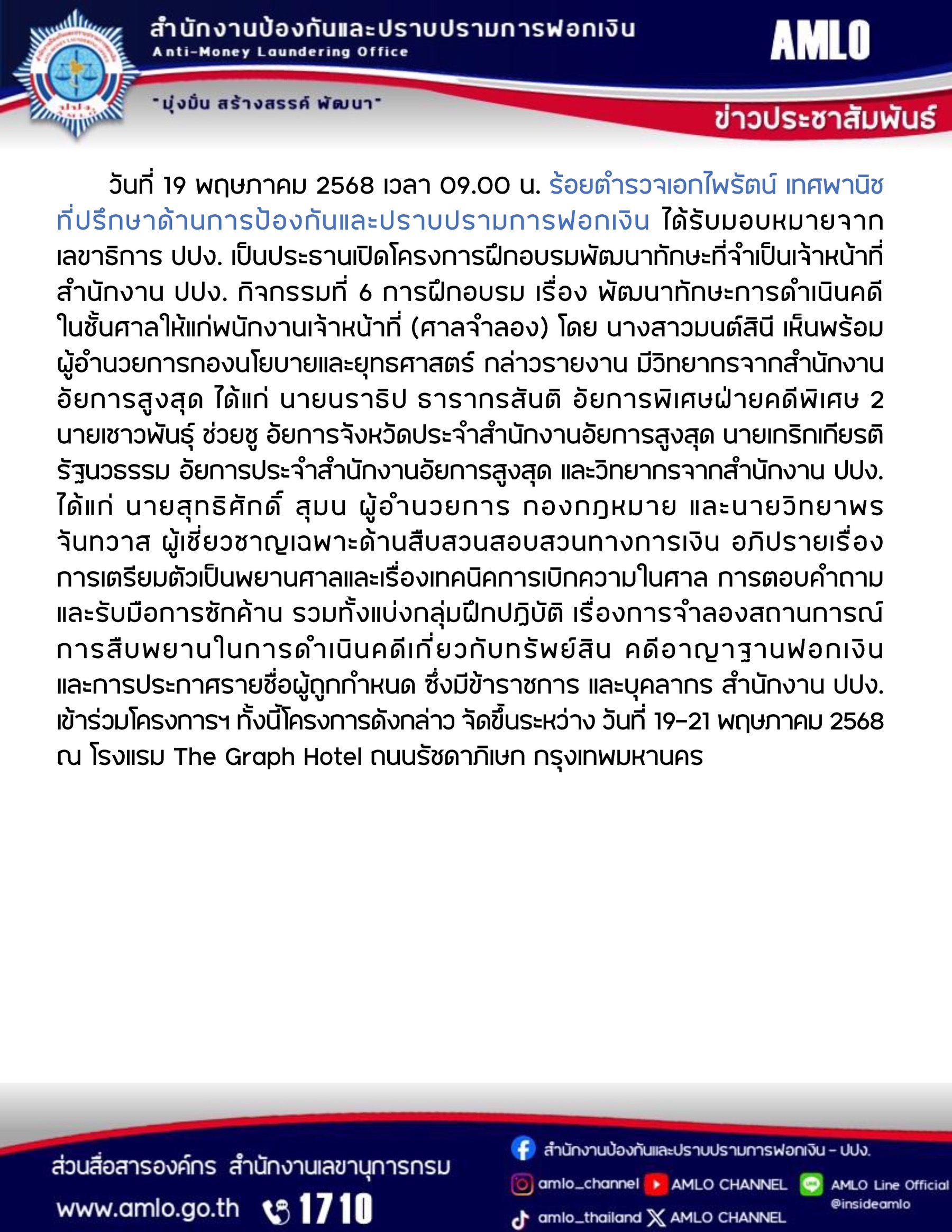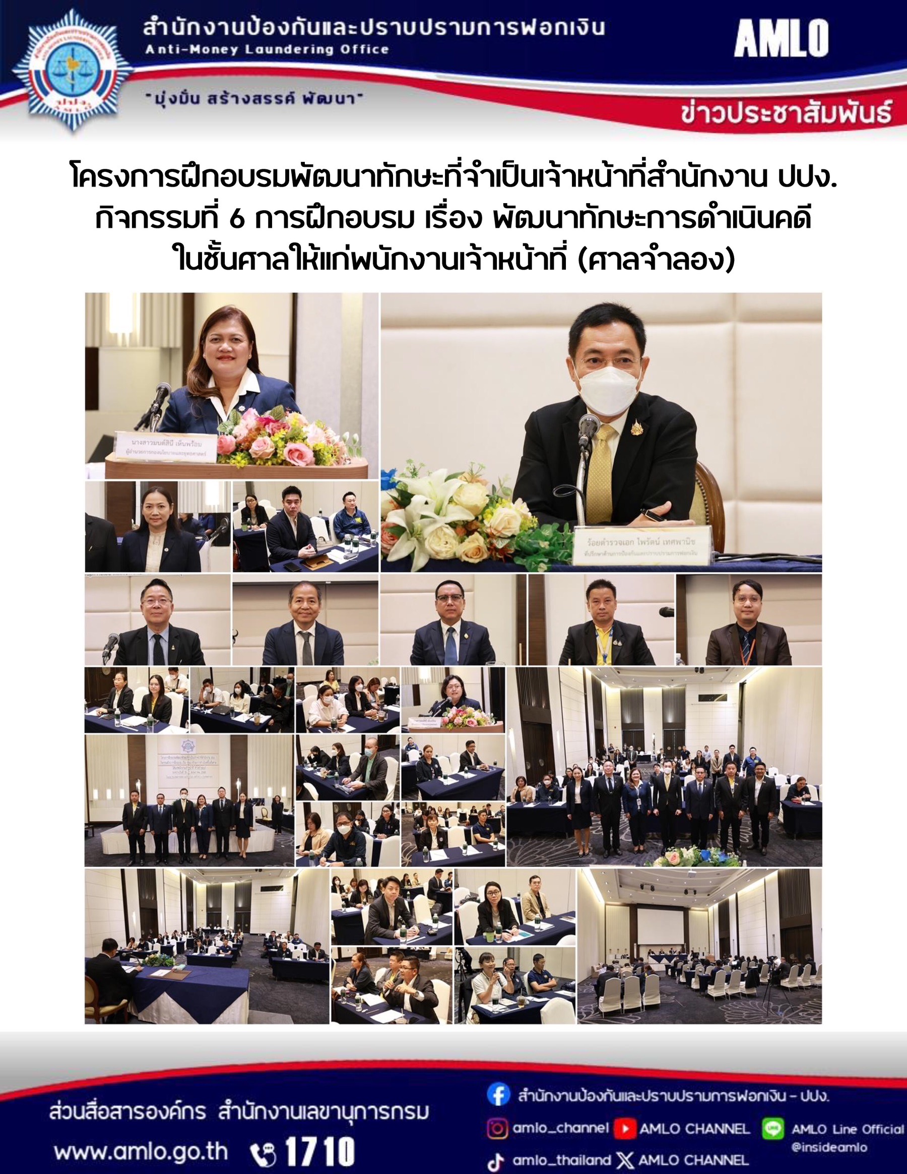 โครงการฝึกอบรมพัฒนาทักษะที่จำเป็นของเจ้าหน้าที่สำนักงาน ปปง. กิจกรรมที่ 6 การฝึกอบรม เรื่อง พัฒนาทักษะการดำเนินคดีในชั้นศาลให้แก่พนังานเจ้าหน้าที่ (ศาลจำลอง)
