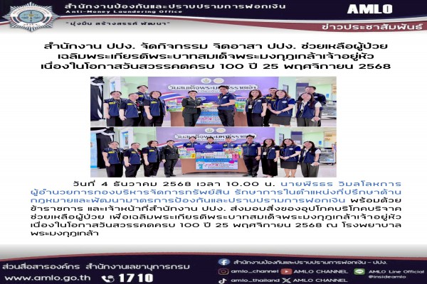 สำนักงาน ปปง. จัดกิจกรรม จิตอาสา ปปง. ช่วยเหลือผู้ป่วยเฉลิมพระเกียรติพระยาทสมเด็จพระมงกุฎเกล้าเจ้าอยู่หัวเนื่องในวันสวรรคตครบ ๑๐๐ ปี ๒๕ พฤศจิกายน ๒๕๖๘