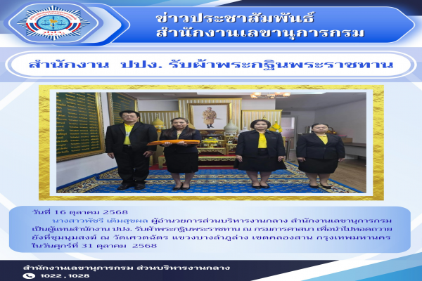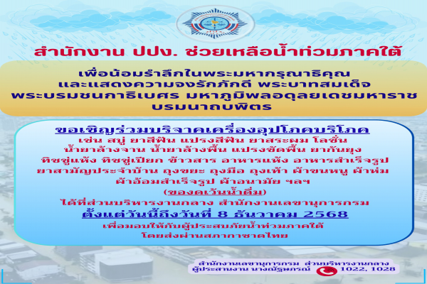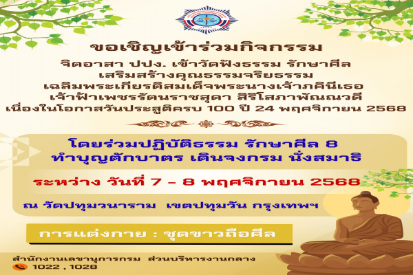 ขอเชิญเข้าร่วมกิจกรรม จิตอาสา ปปง. เข้าวัดฟังธรรม รักษาศิล เสริมสร้างคุณธรรมจริยธรรม เฉลิมพระเกียรติสมเด็จพระนางเจ้าภคินีเธอเจ้าฟ้าเพชรรัตนราชสุดา สิริโสภาพัณณวดี เนื่องในโอกาสวันประสูติครบ 100 ปี 24 พฤศจิกายน 2568 ระหว่างวันที่ 7 - 8 พฤศจิกายน 2568 ณ วัดปทุมวนาราม เขตปทุมวัน กรุงเทพฯ